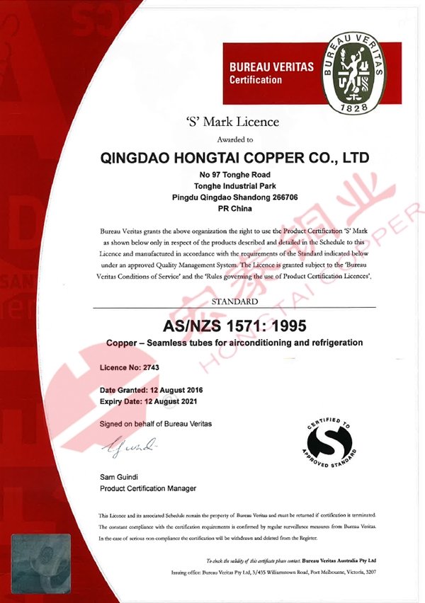 近日宏泰接到國際知名認(rèn)證機(jī)構(gòu)必維國際檢驗(yàn)集團(tuán)(Bureau Veritas)通知,宏泰銅管產(chǎn)品再次通過NZS 3501水汽衛(wèi)生用銅管標(biāo)準(zhǔn)認(rèn)證【證書編號:2742】、AS/NZS 1571無縫制冷用銅管標(biāo)準(zhǔn)認(rèn)證【證書編號:2743】和AS 1432 給排水銅管標(biāo)準(zhǔn)認(rèn)證【證書編號:23264】。此三項(xiàng)認(rèn)證是宏泰在2004年首次通過上述認(rèn)證后與標(biāo)準(zhǔn)體系的同步更新認(rèn)證。