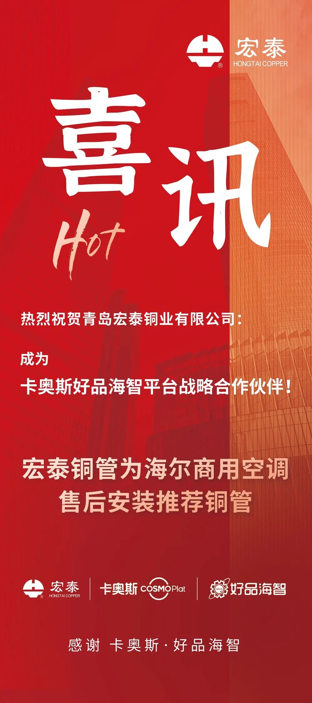 與卡奧斯好品海智平臺達成合作關系,離不開宏泰銅管一直以來秉持“質量第一、服務至上”的經營理念,全面貫徹ISO9001:2015質量管理體系,建立了嚴格的質量監控制度和售后服務保障機制。宏泰紫銅管產品遠銷歐美、東南亞、中東、澳大利亞等國家和地區,深受客戶的贊譽和信賴。